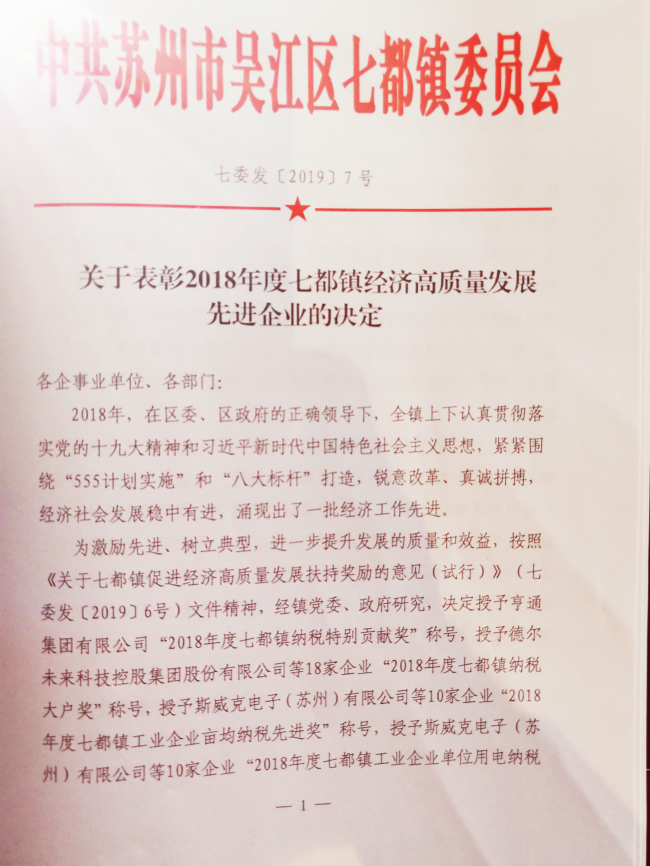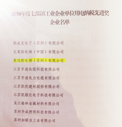 2019年2月14日,豬年初十,情人節(jié)。下午2:00時(shí)分,公司潘偉榮總經(jīng)理從開會(huì)現(xiàn)場(chǎng)傳來喜訊:奧瑪斯電梯(蘇州)有限公司榮獲“2018年度吳江七都鎮(zhèn)單位用電納稅先進(jìn)獎(jiǎng)” (見下列獲獎(jiǎng)名單及獎(jiǎng)牌) 及“2018度年吳江七都鎮(zhèn)單位納稅百強(qiáng)企業(yè)”的殊榮。這種榮譽(yù),奧瑪斯公司連續(xù)保持了4年。